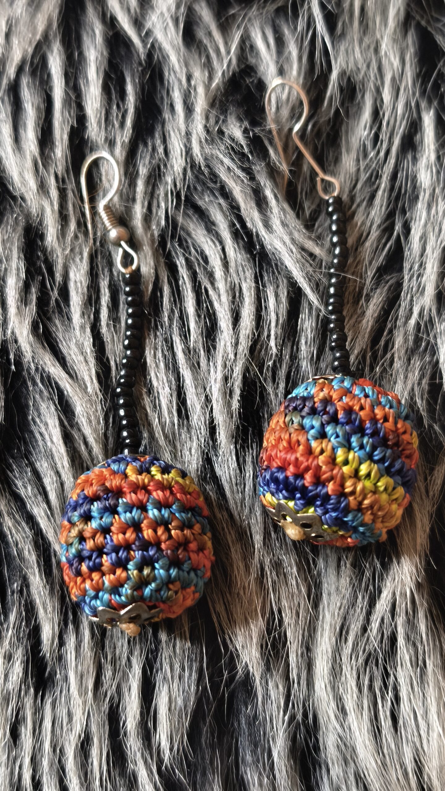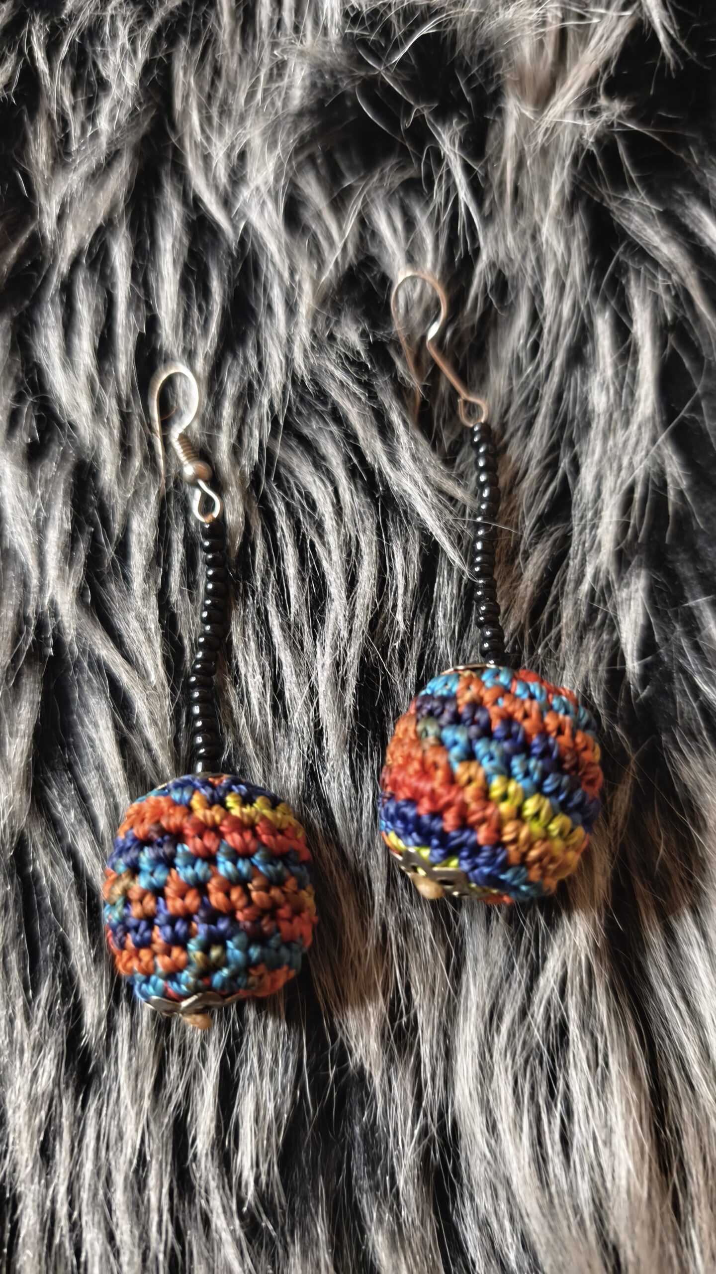 Ces boucles d’oreilles uniques dévoilent un délicat travail artisanal : une perle volumineuse recouverte d’un tissage coloré façon crochet, mêlant harmonieusement tons chauds et nuances vibrantes. Suspendues à un fin fil de perles noires, elles offrent un équilibre parfait entre sophistication et esprit bohème.