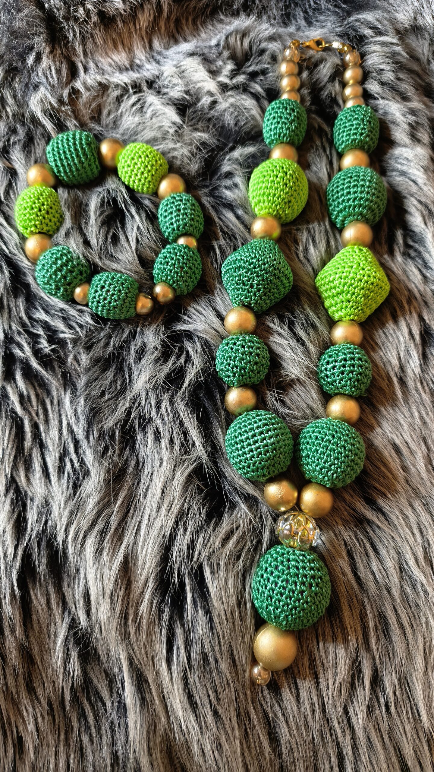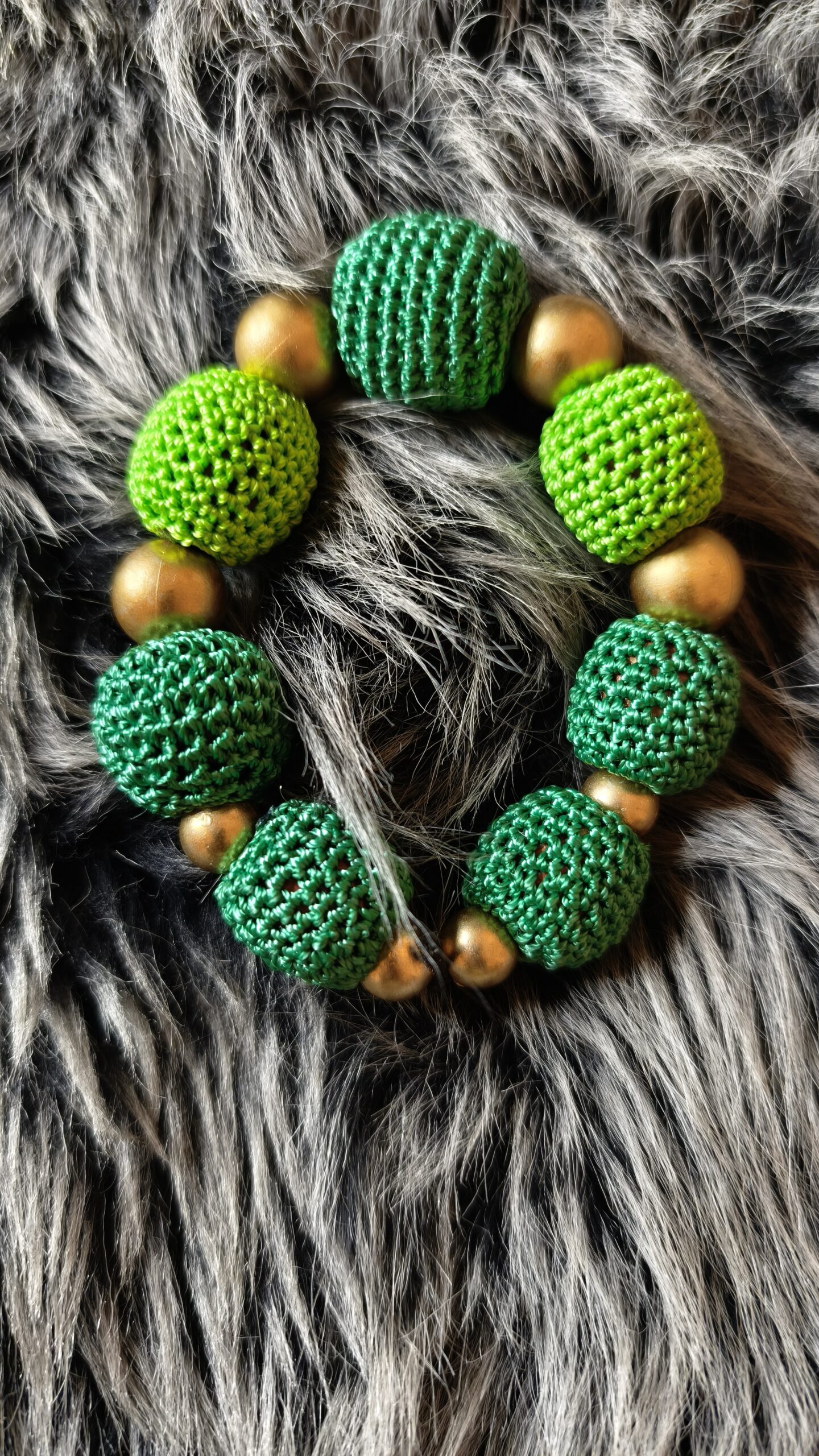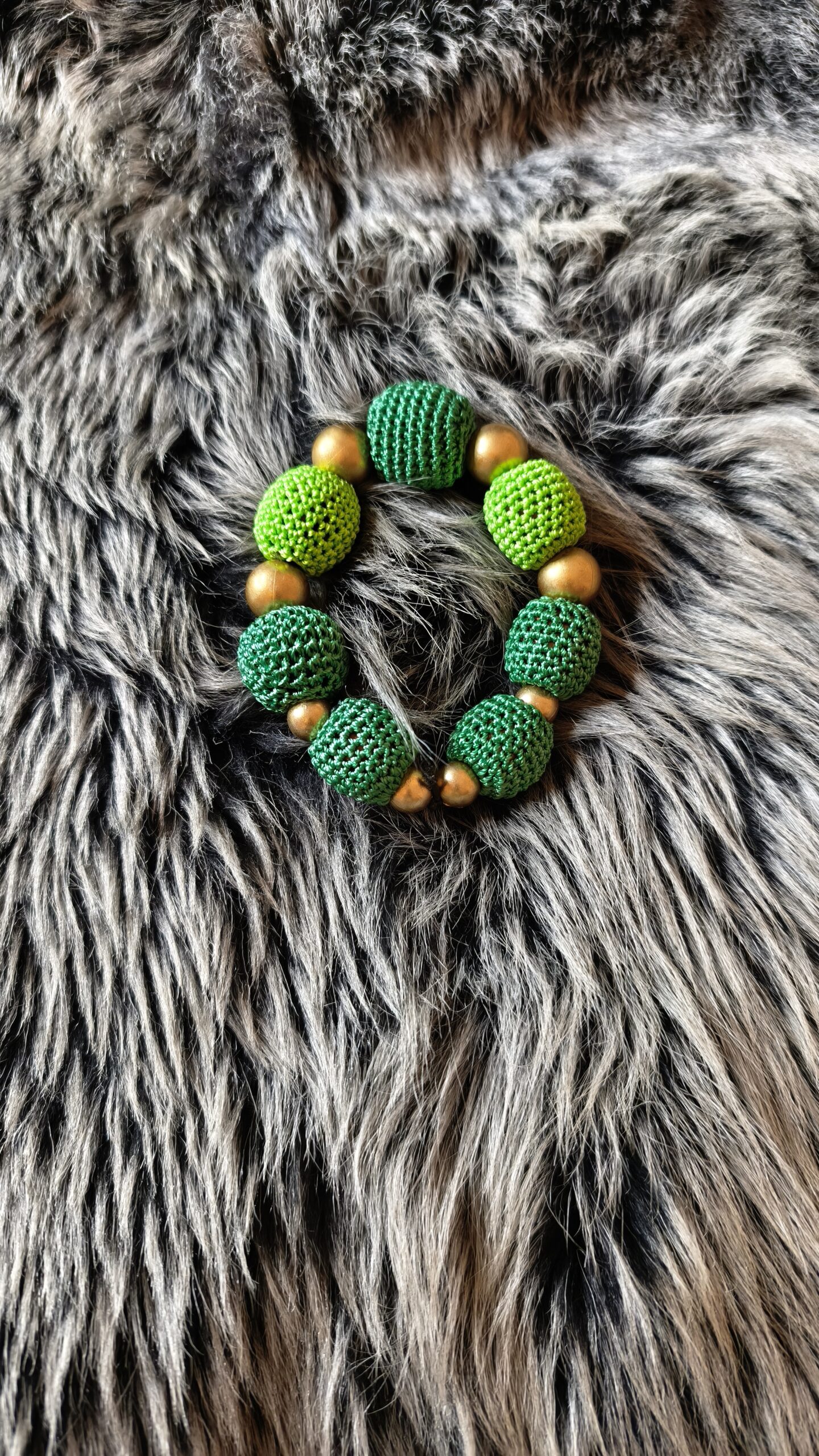 Ce bracelet artisanal mêle des perles crochetées vert profond et vert citron à de délicates perles dorées, créant un jeu de textures raffiné. Une pièce lumineuse, vibrante et naturellement élégante, pensée pour sublimer le poignet avec douceur et caractère.