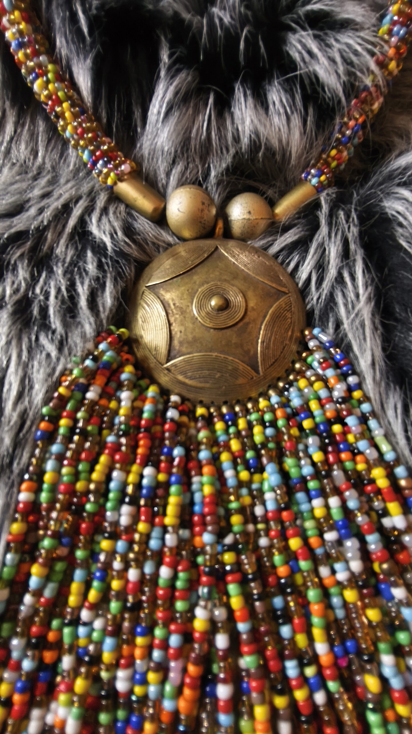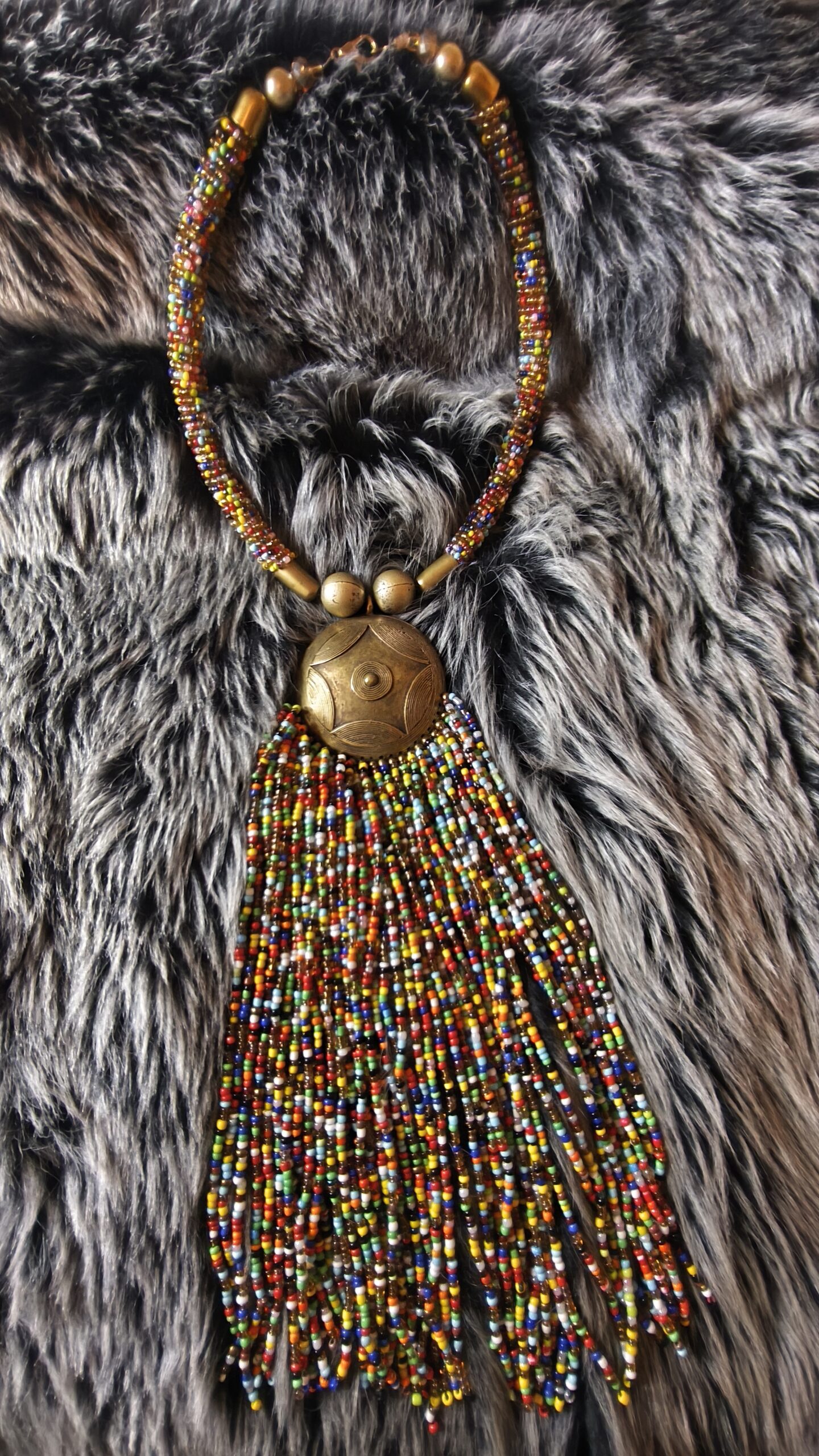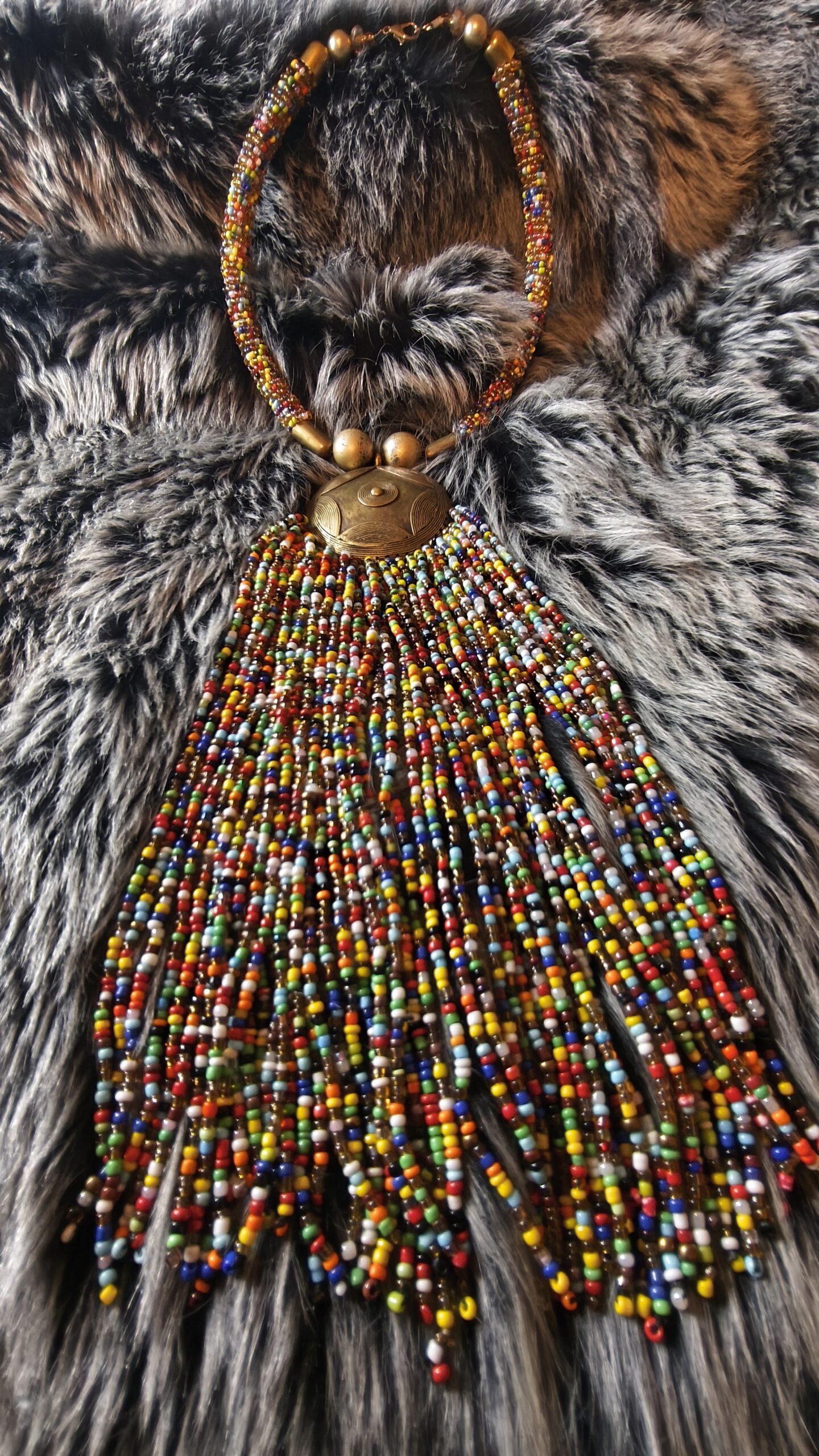 Collier « Cascade d’Héritages » : Cette pièce unique associe un médaillon aux lignes traditionnelles à une profusion de perles multicolores formant une cascade large et vibrante. Le tour de cou, rythmé de perles et d’éléments métalliques patinés, offre une présence remarquable et chaleureuse. L’ensemble se distingue par son caractère artisanal, son énergie chromatique et son élégance bohème, faisant de ce collier une création forte, idéale pour sublimer une tenue et affirmer un style exotique et singulier.