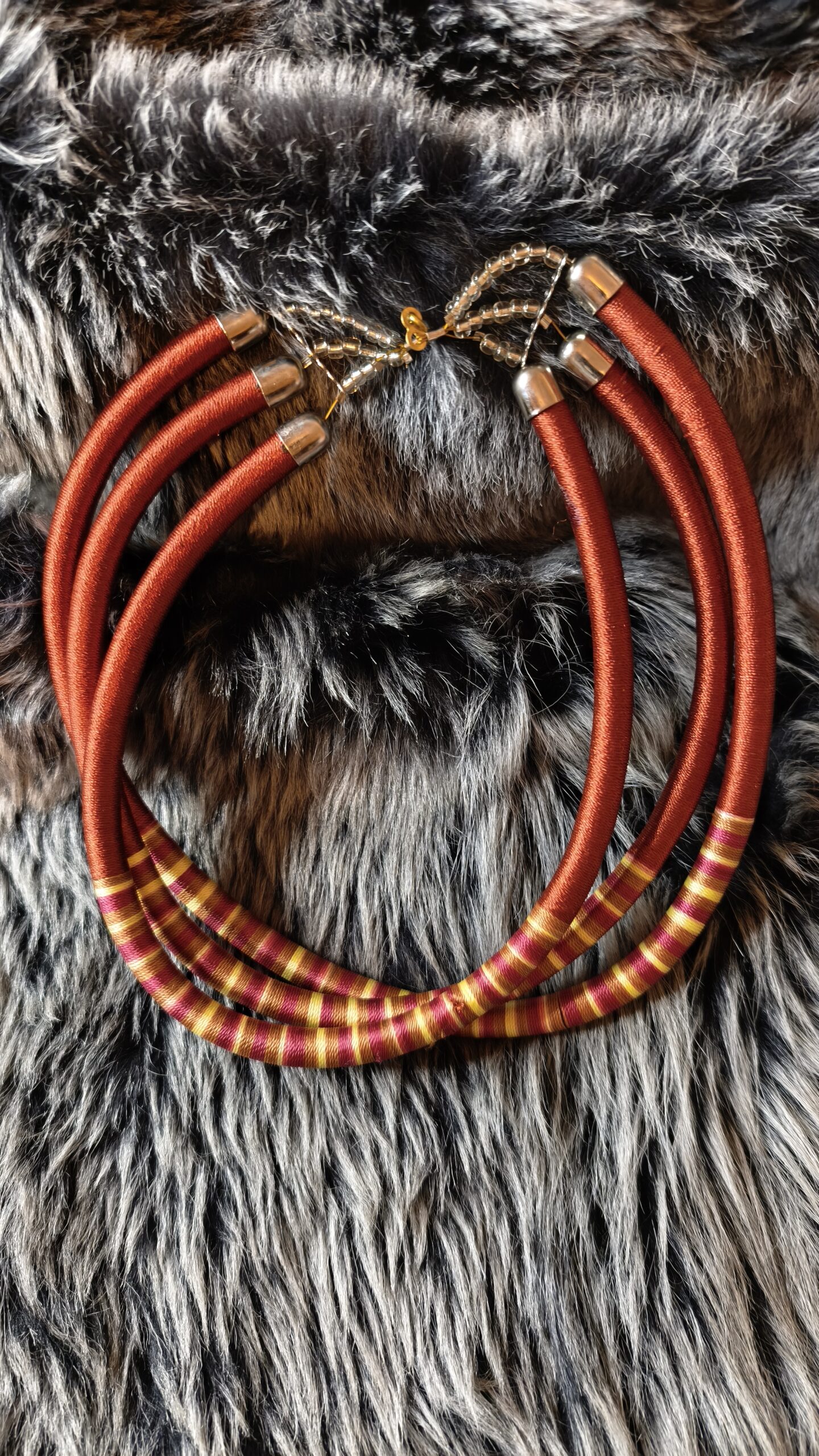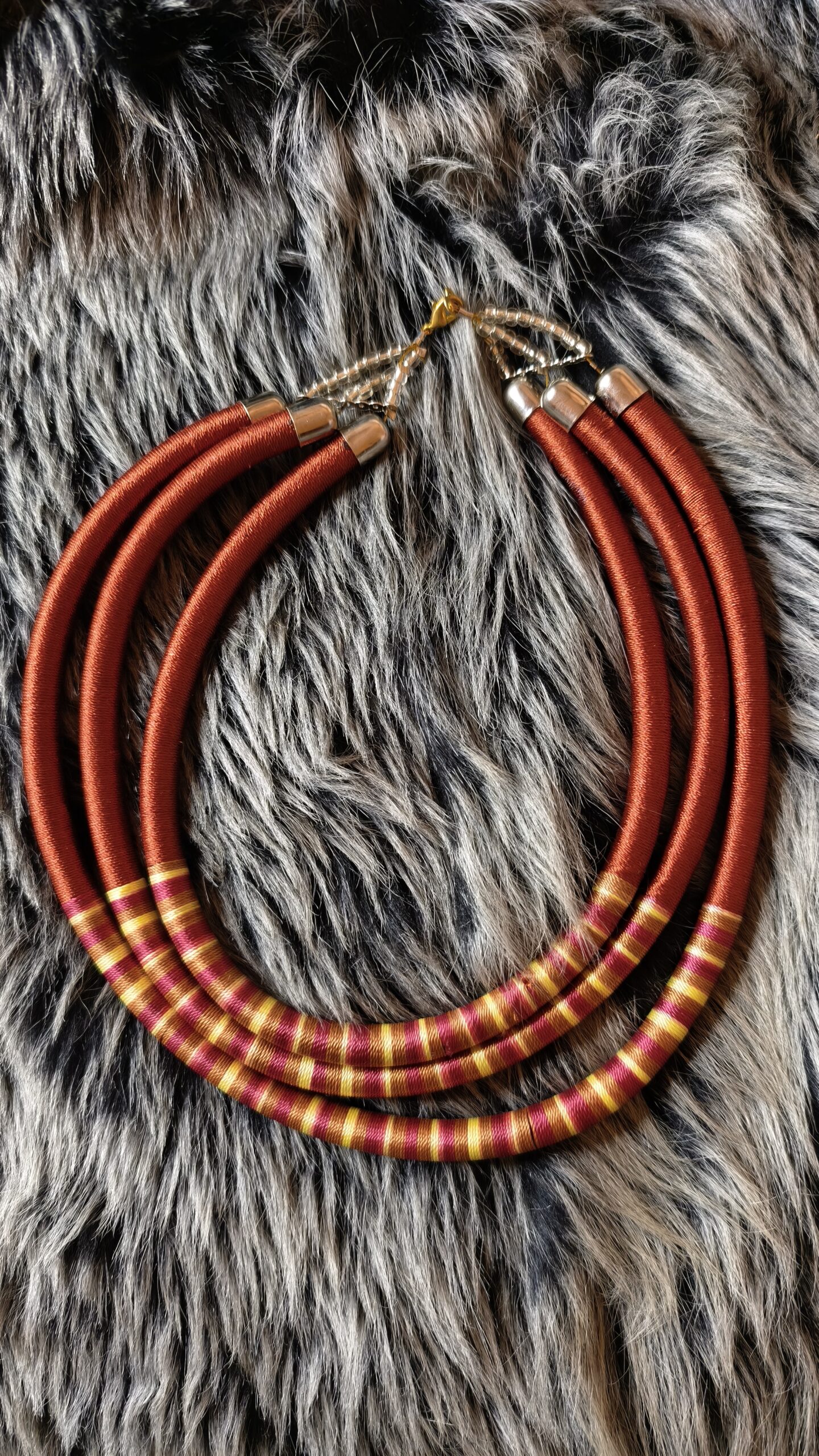 Ce collier à trois rangs associe un rouge profond lumineux à de fines rayures safran et dorées, créant un éclat chaleureux et raffiné. Ses lignes satinées et ses finitions métalliques lui donnent une allure moderne, élégante et pleine de caractère.