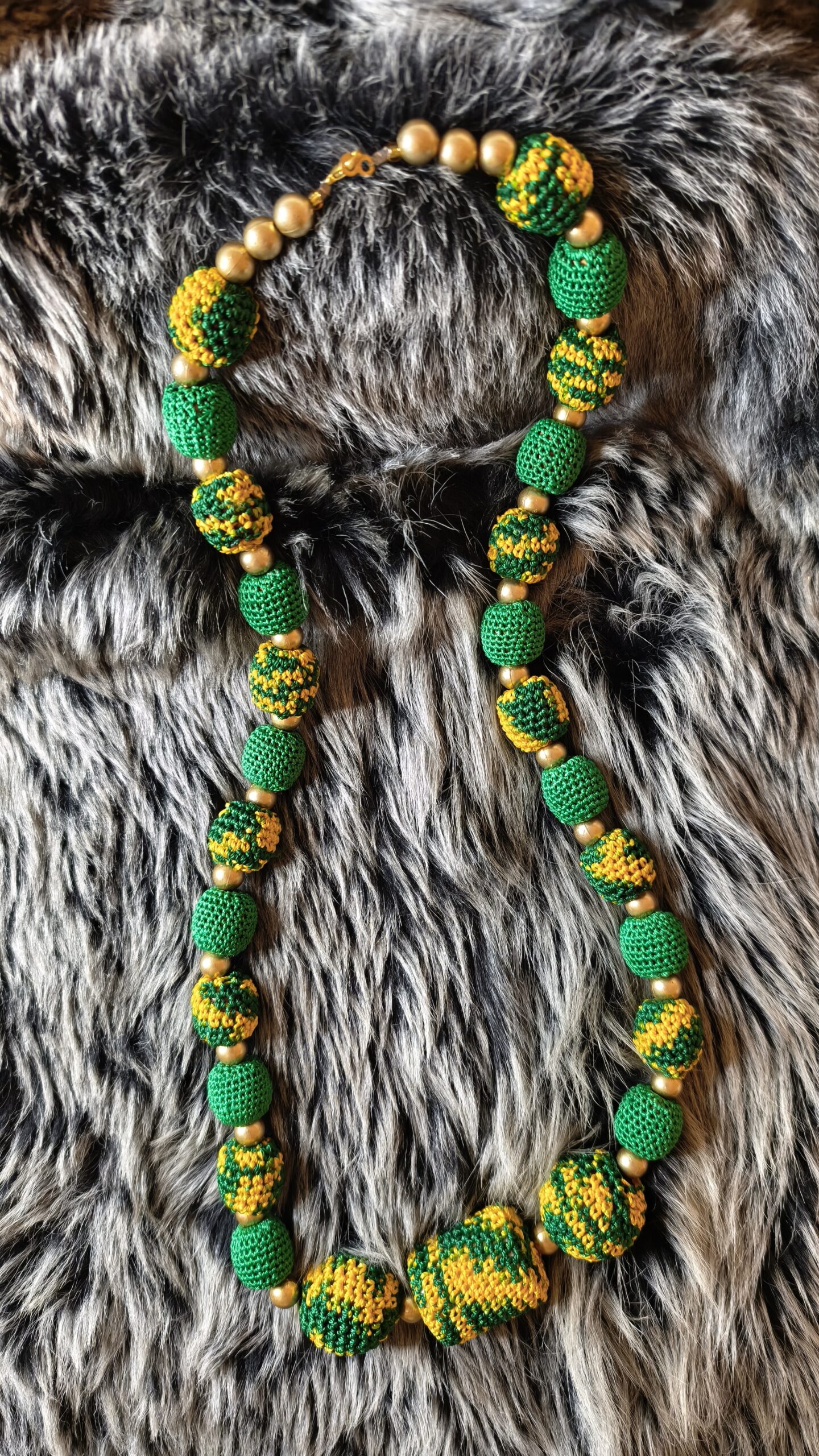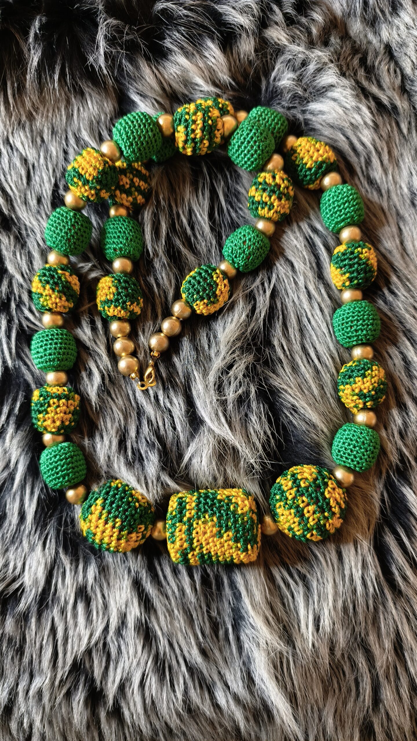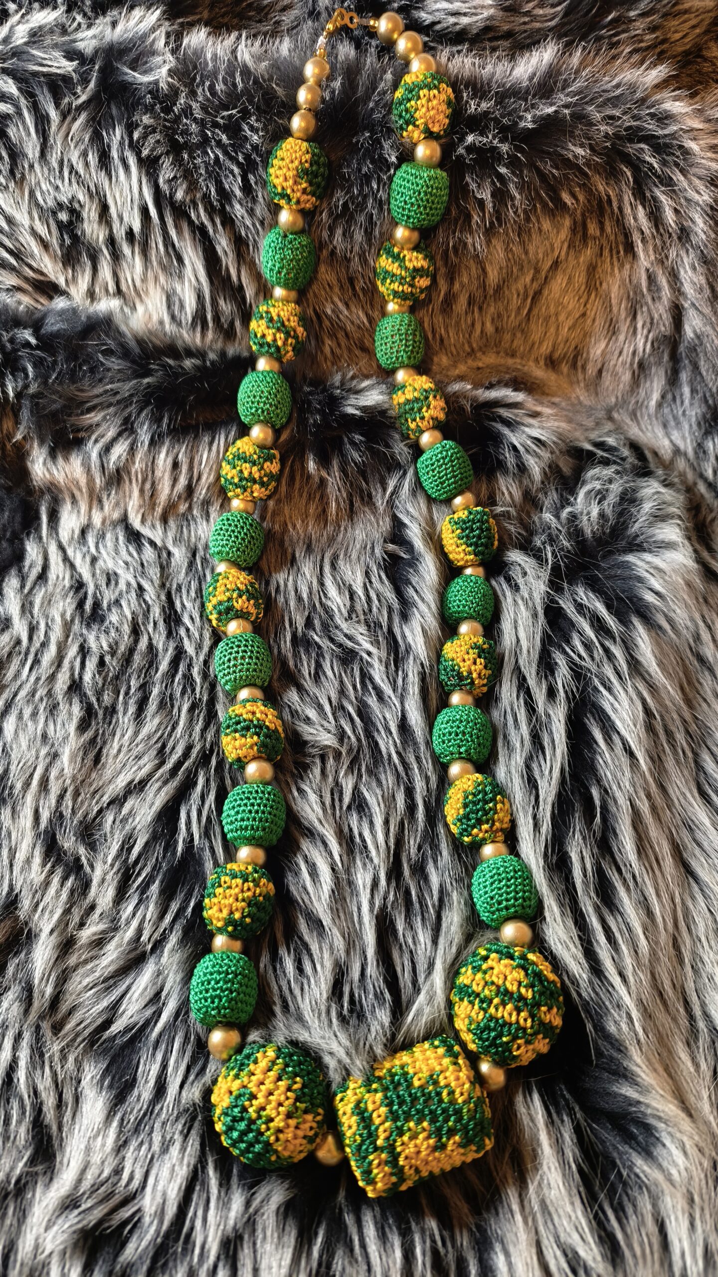 Ce collier somptueux se compose d’une alternance de perles en macramé vert profond et jaune doré, tissées à la main avec une précision remarquable. Chaque perle raconte un geste d’artisan, chaque motif évoque la terre, la lumière et les couleurs vibrantes de la savane africaine. Les perles dorées qui ponctuent l’ensemble apportent chaleur et équilibre, créant un collier à la fois puissant, raffiné et rayonnant. Une pièce unique qui affirme style, caractère et élégance.