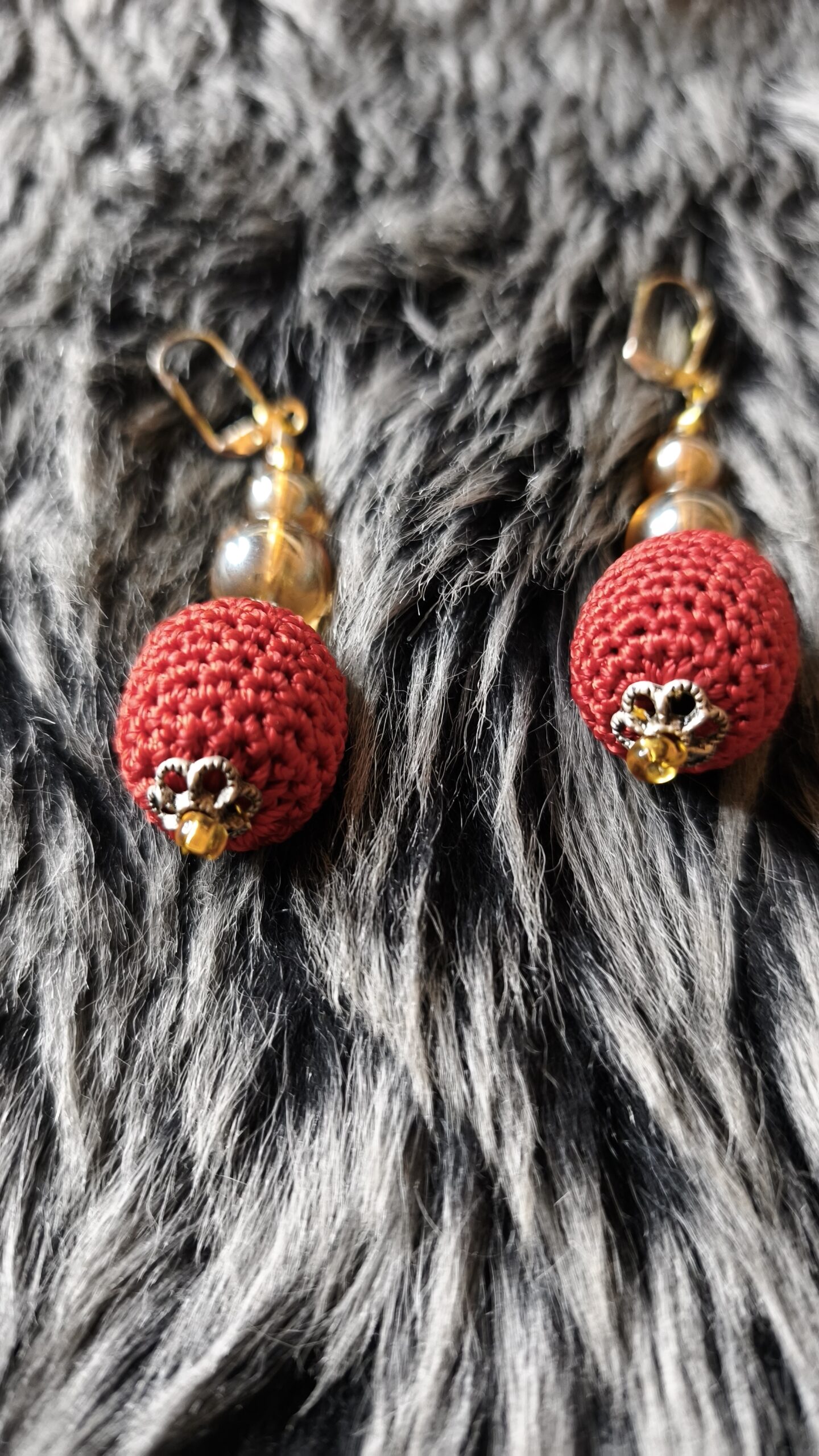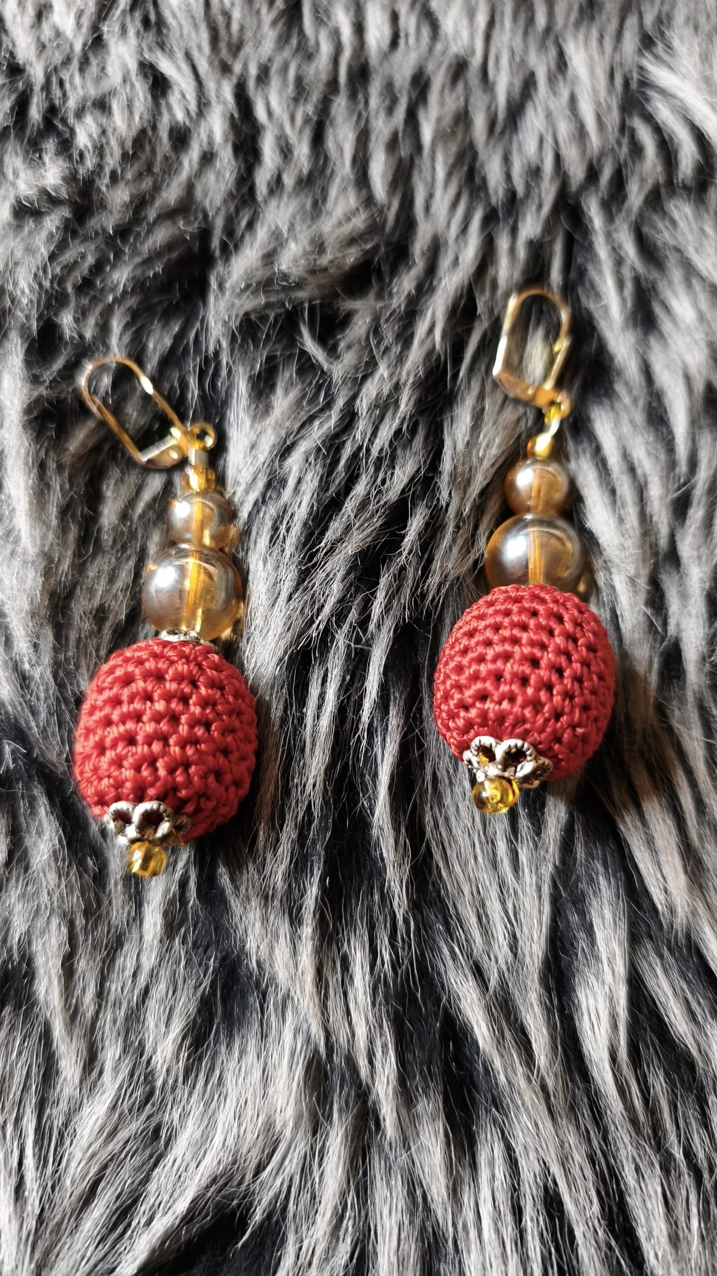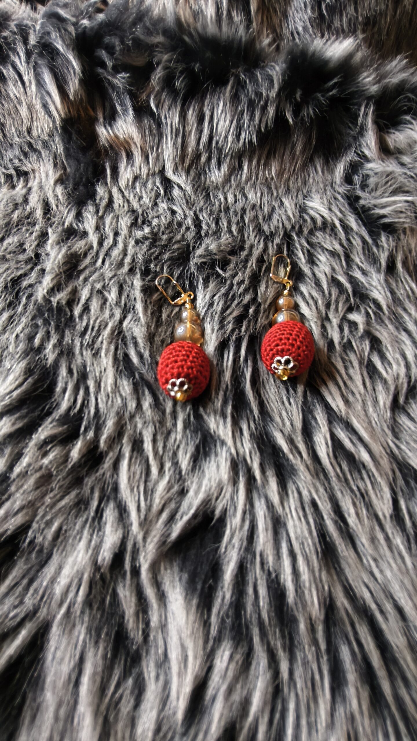 Ces boucles d’oreilles artisanales présentent de délicates perles en macramé rouge profond, entièrement tissées à la main pour une texture élégante et chaleureuse. Elles sont associées à des perles dorées et translucides qui apportent lumière et sophistication, créant un contraste raffiné. Légères, féminines et éclatantes.