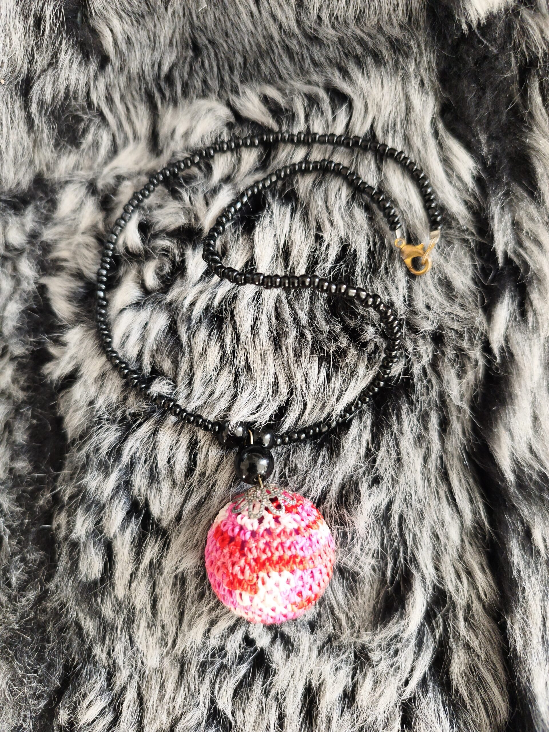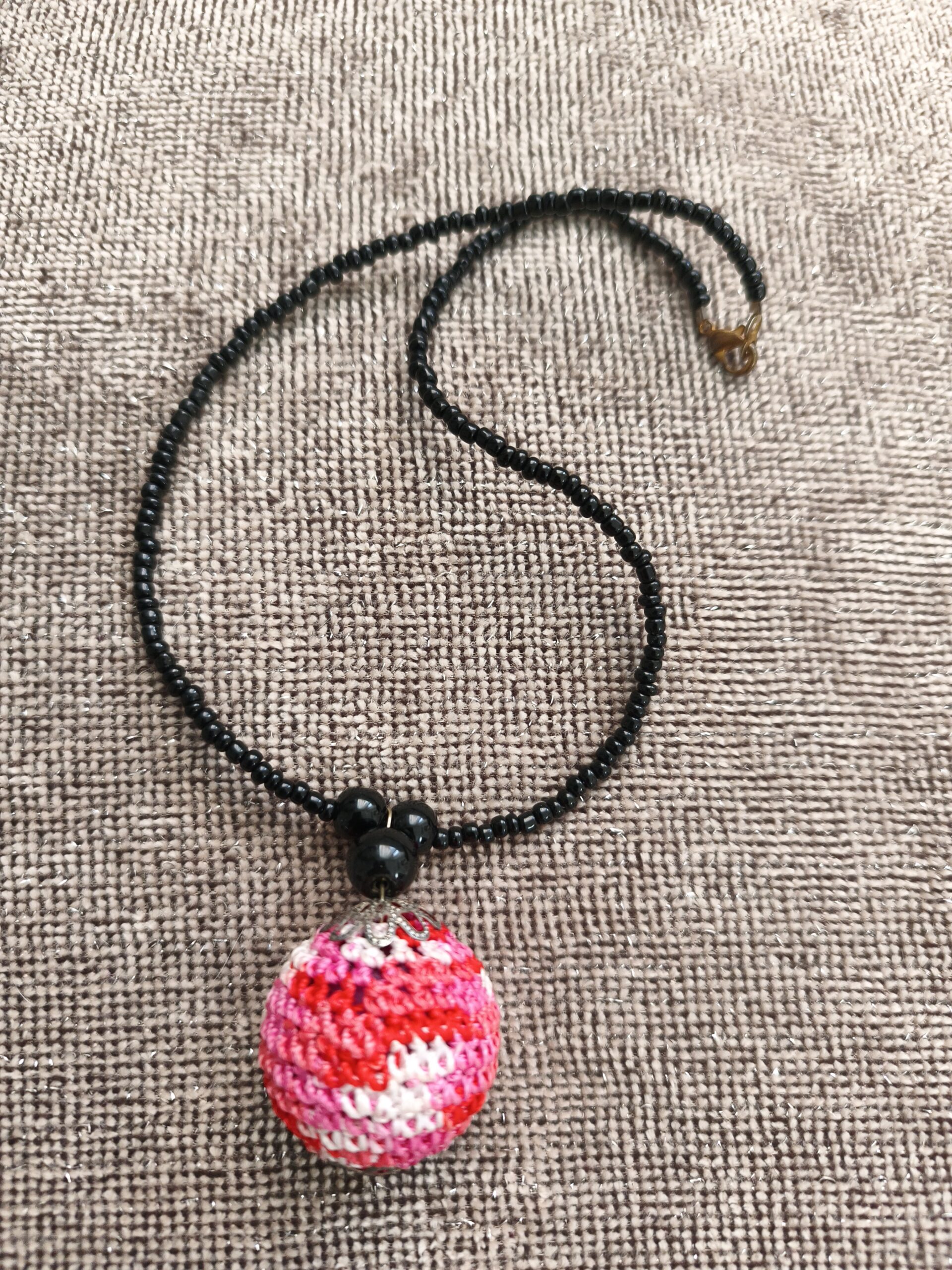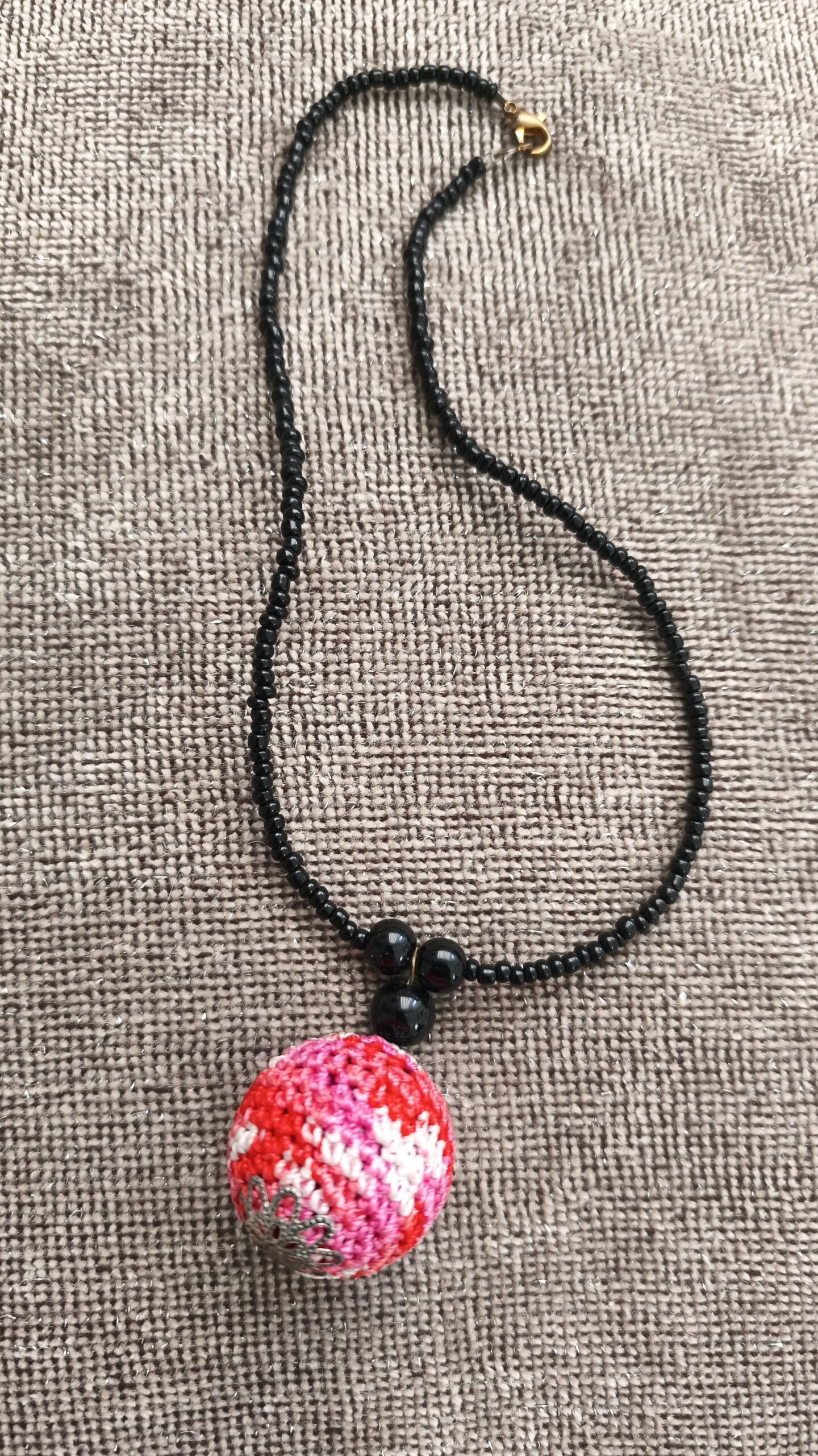 Un collier élégant et artisanal, composé d’un cordon finement perlé noir et d’un pendentif boule crocheté à la main dans des nuances vibrantes de rouge, rose et blanc. Son design délicat mêle authenticité, modernité et raffinement.