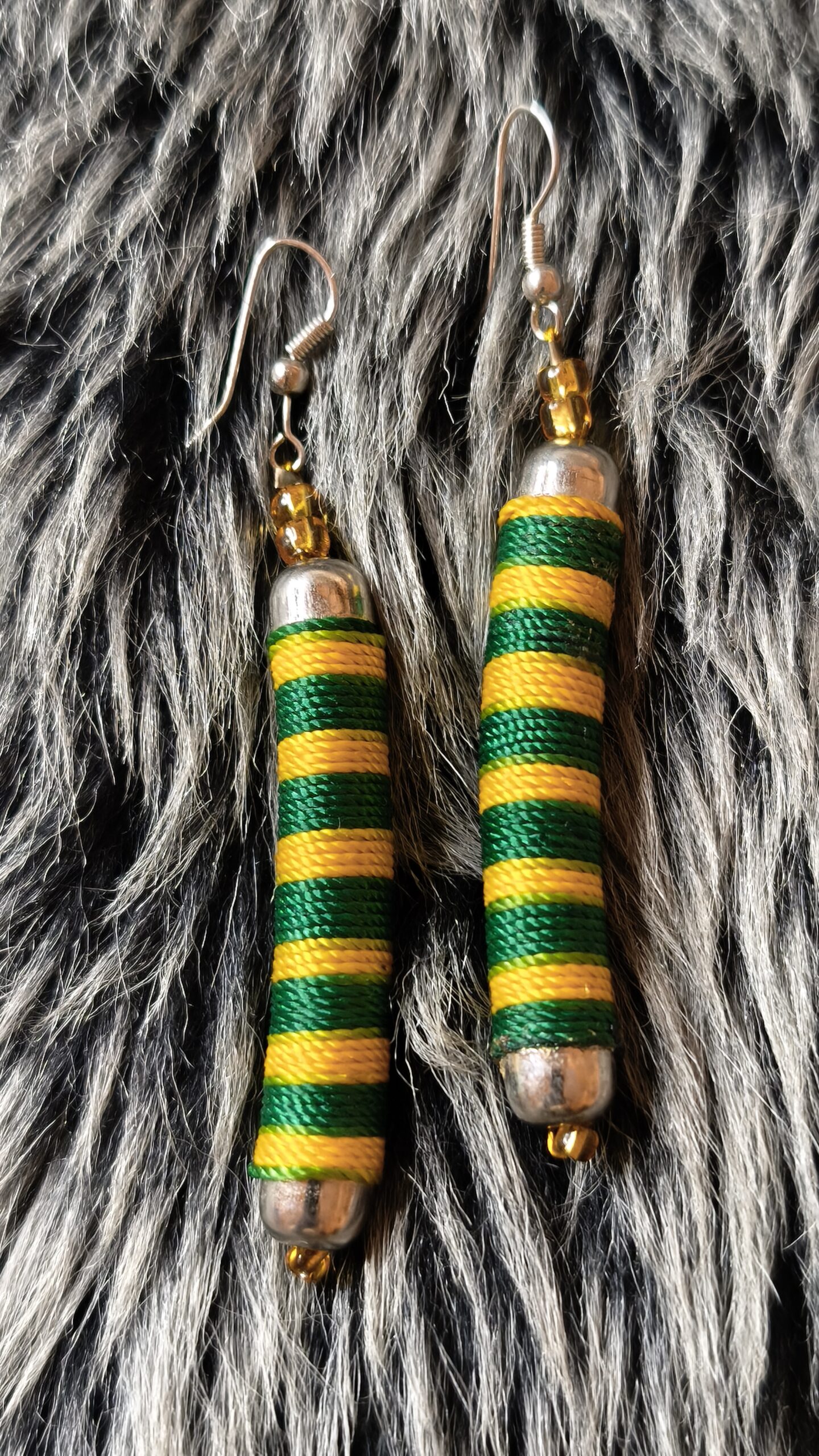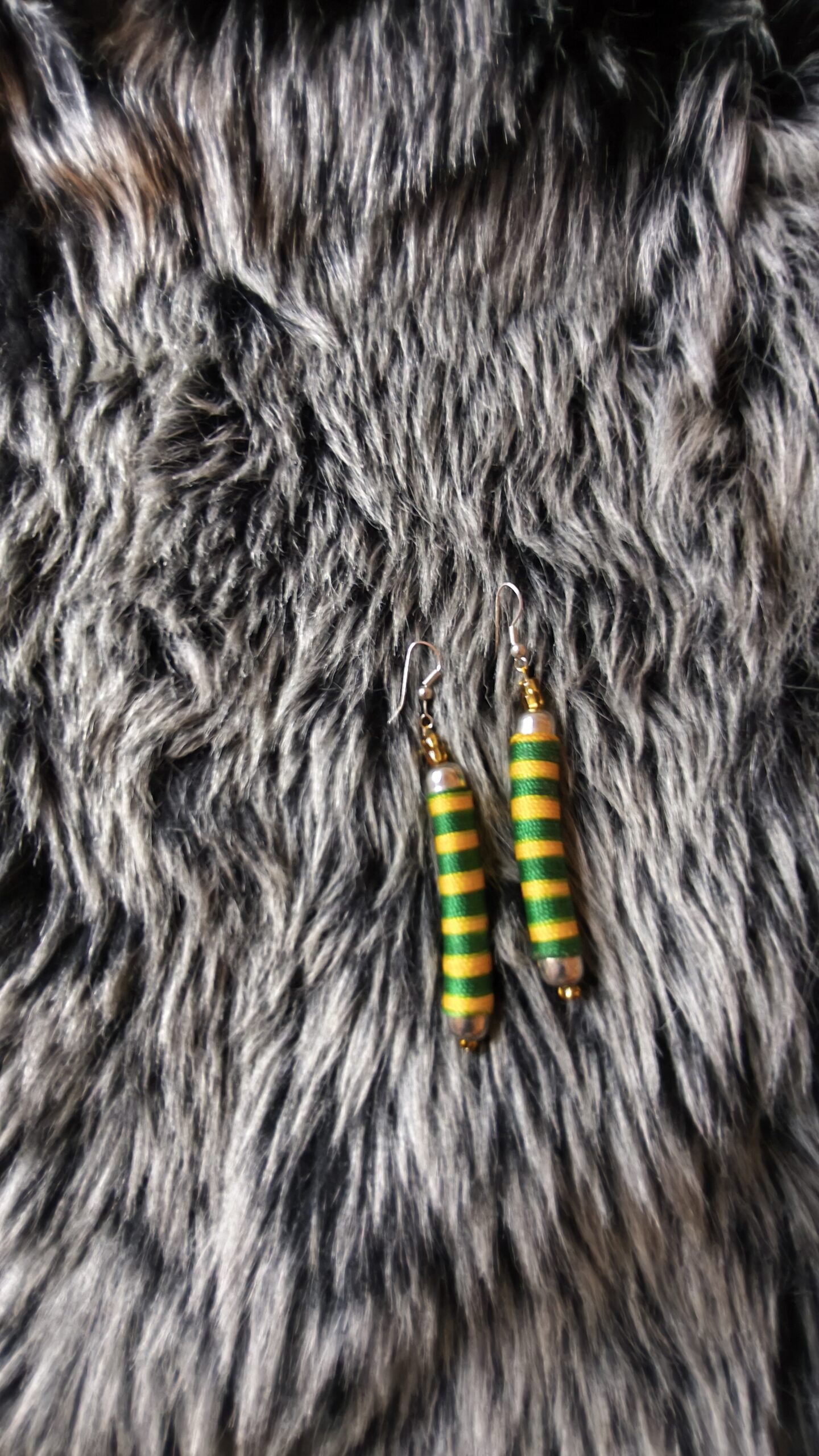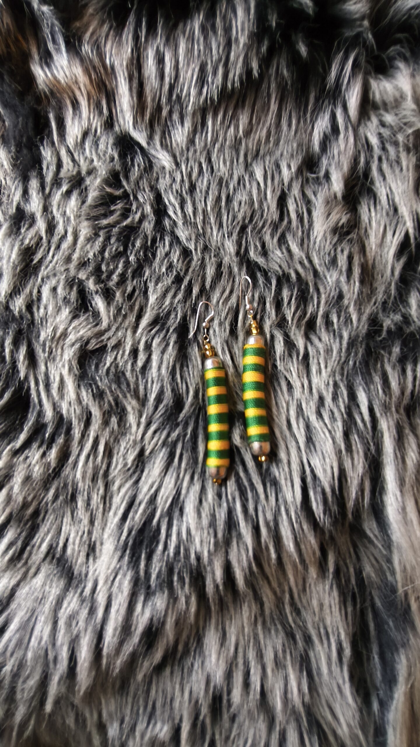 Ces boucles d’oreilles artisanales se distinguent par leurs tiges élégamment enroulées de fils vert et jaune, formant un motif rayé dynamique et moderne. Les embouts métallisés argentés, associés à de petites perles dorées, ajoutent une touche lumineuse et contemporaine.