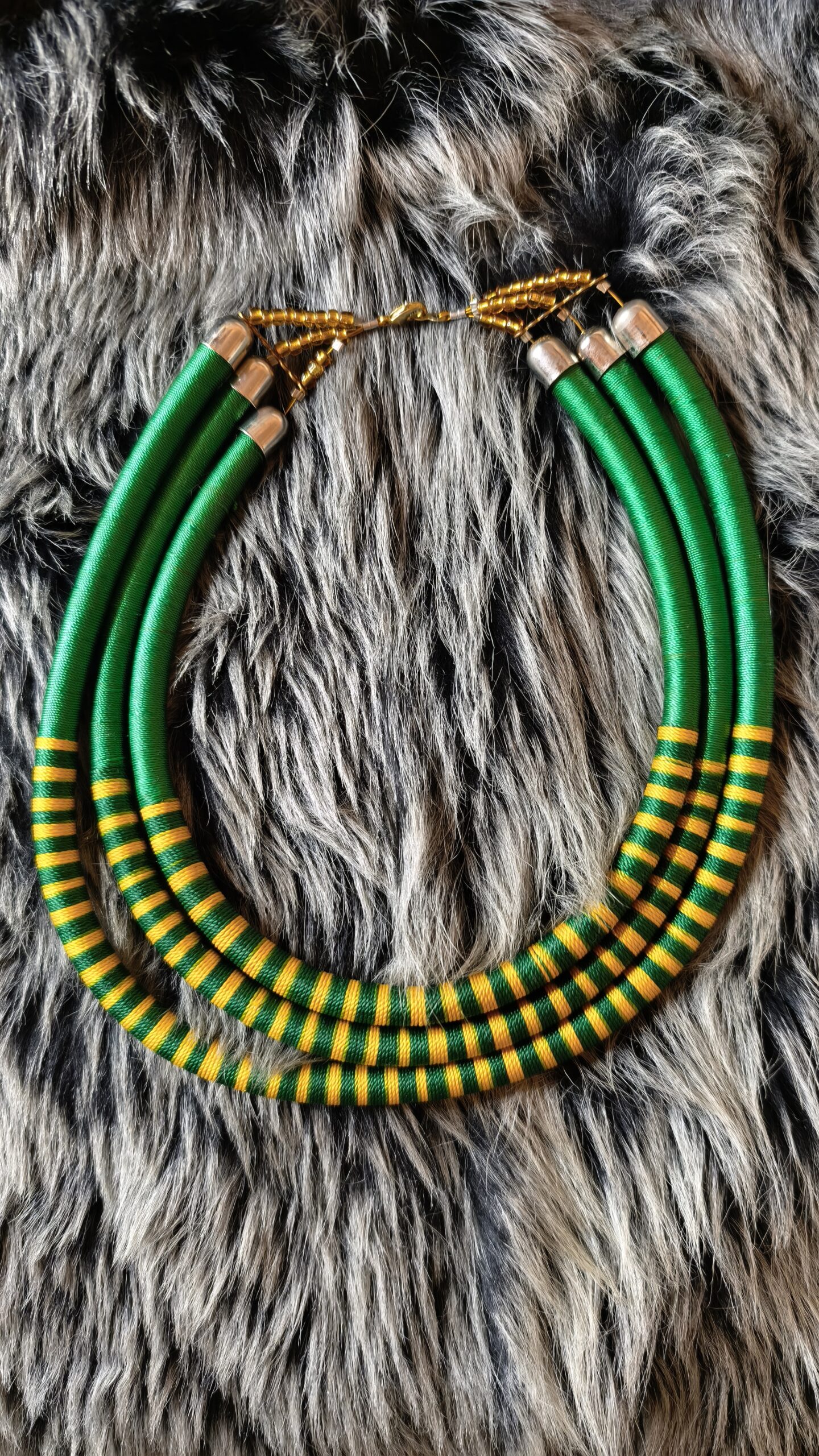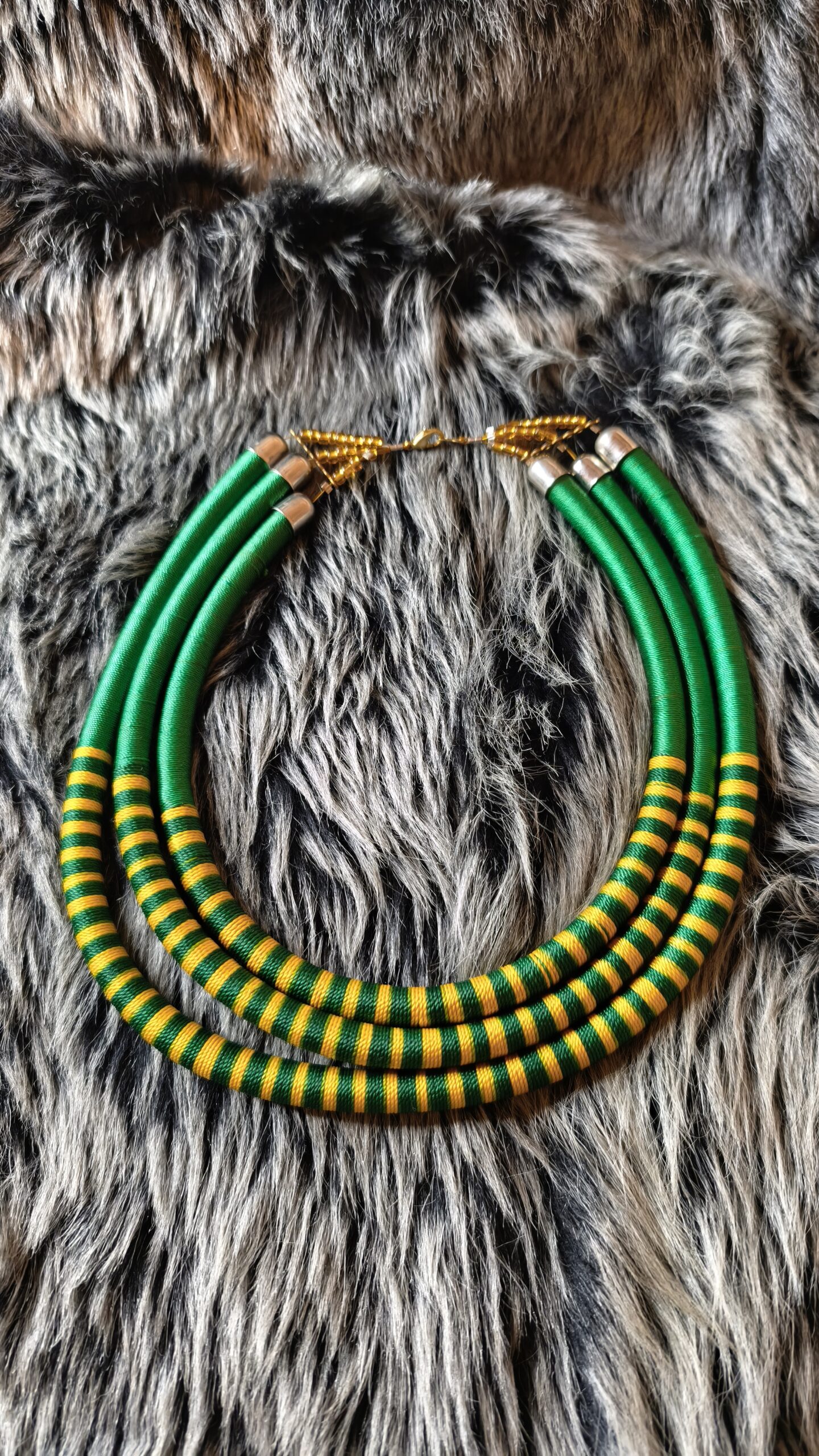 Rayon Émeraude” est un collier à trois rangs en fil satiné vert profond, sublimé par de fines rayures dorées qui captent la lumière. Ses lignes épurées et ses finitions dorées lui donnent une allure moderne et raffinée, idéale pour un style chic et affirmé.